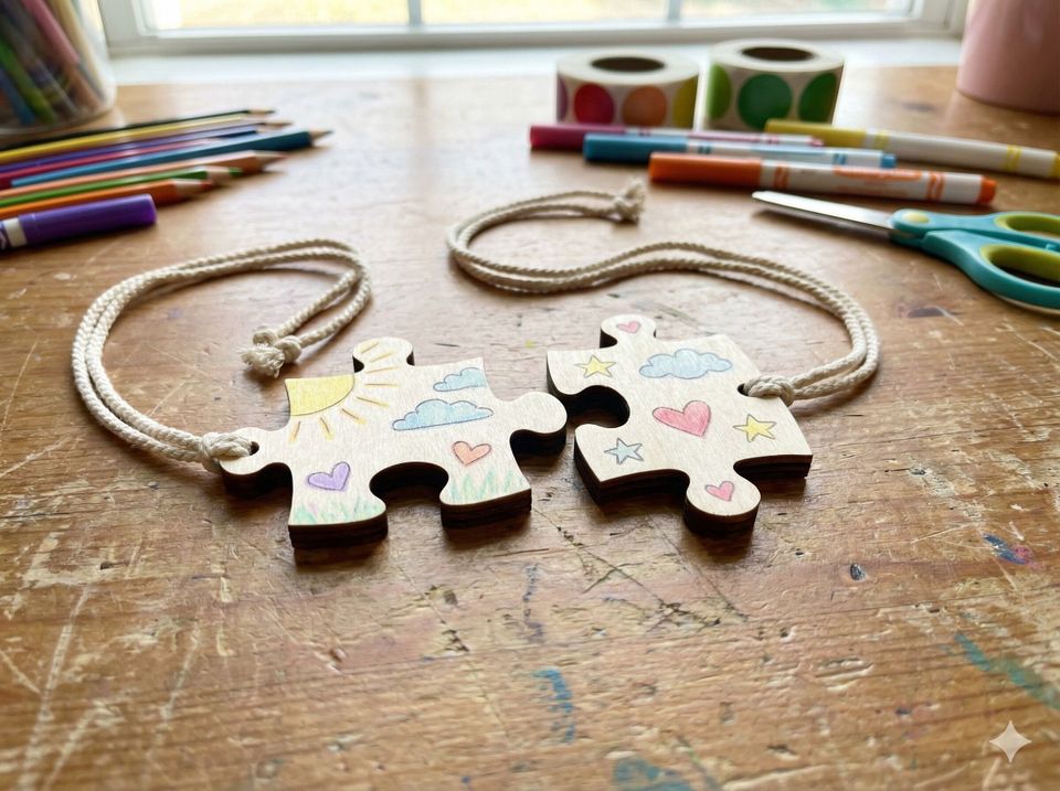 Versier de puzzelstukjes, precies zoals jij mooi vindt. Zo maak je samen een unieke vriendschapshanger die laat zien dat jullie bij elkaar horen.