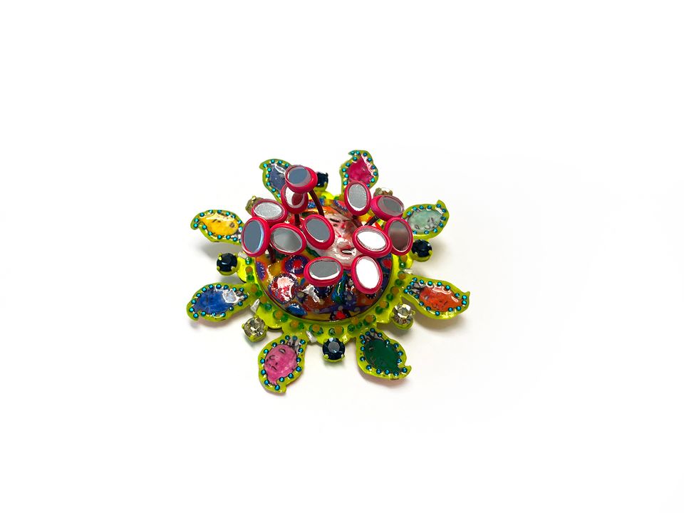 broche, wit en geel koper, spiegel, Swarovskistenen, kralen, draad