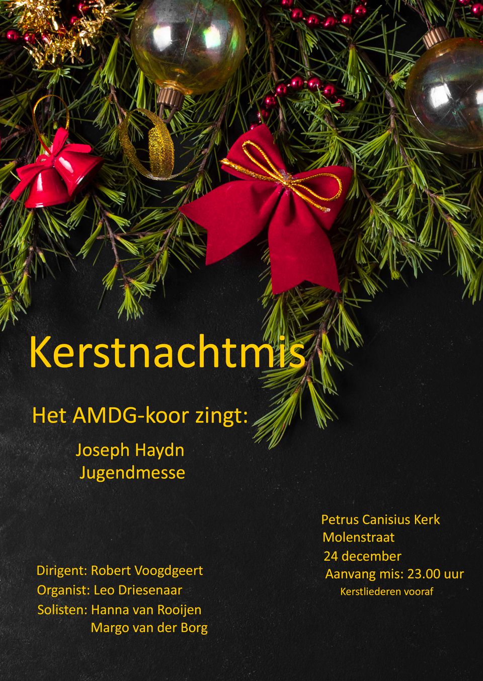 Bij de feestelijke kersthoogmis in de Petrus Canisiuskerk zal de Jugend Messe van Haydn worden uitgevoerd. Daarnaast ook werken van Bach en bekende kerstliederen. De werken worden uitgevoerd door het koor van de Molenstraatkerk, het AMDG Koor aangevuld met gastzangers. Dirigent Robert Voogdgeert en Organist Leo Driesenaar . Solisten: Hanna van Rooijen en Margo van der Borg. Het AMDG koor zingt elke twee weken op zondag een bekende mis uit christelijke koor repertoire. De kerk staat open voor iedereen die geïnteresseerd is in de muziek en de architectuur.
