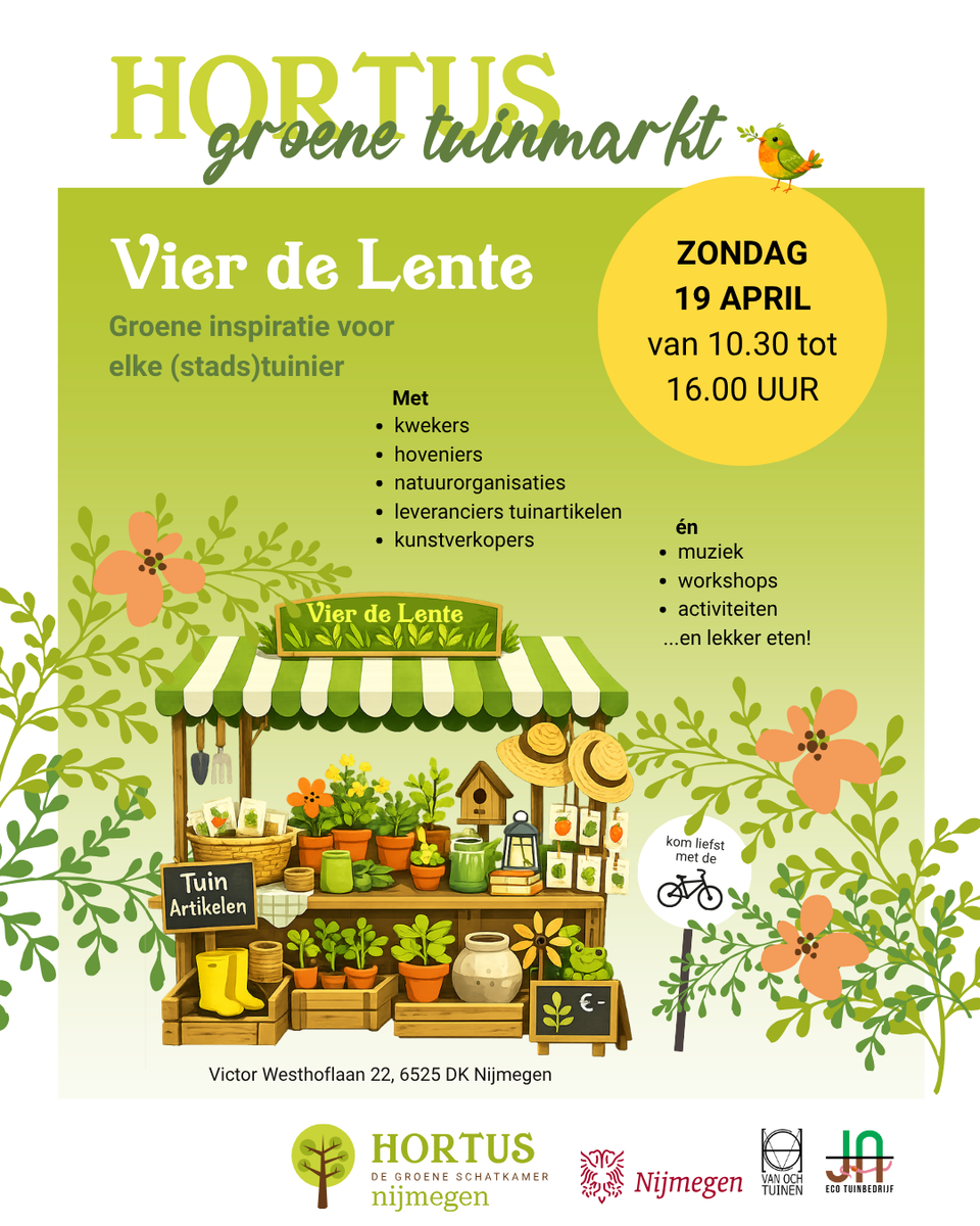 Op zondag 19 april 2026 opent de Hortus Nijmegen het seizoen met de allereerste editie van de groene tuinmarkt Vier de lente.