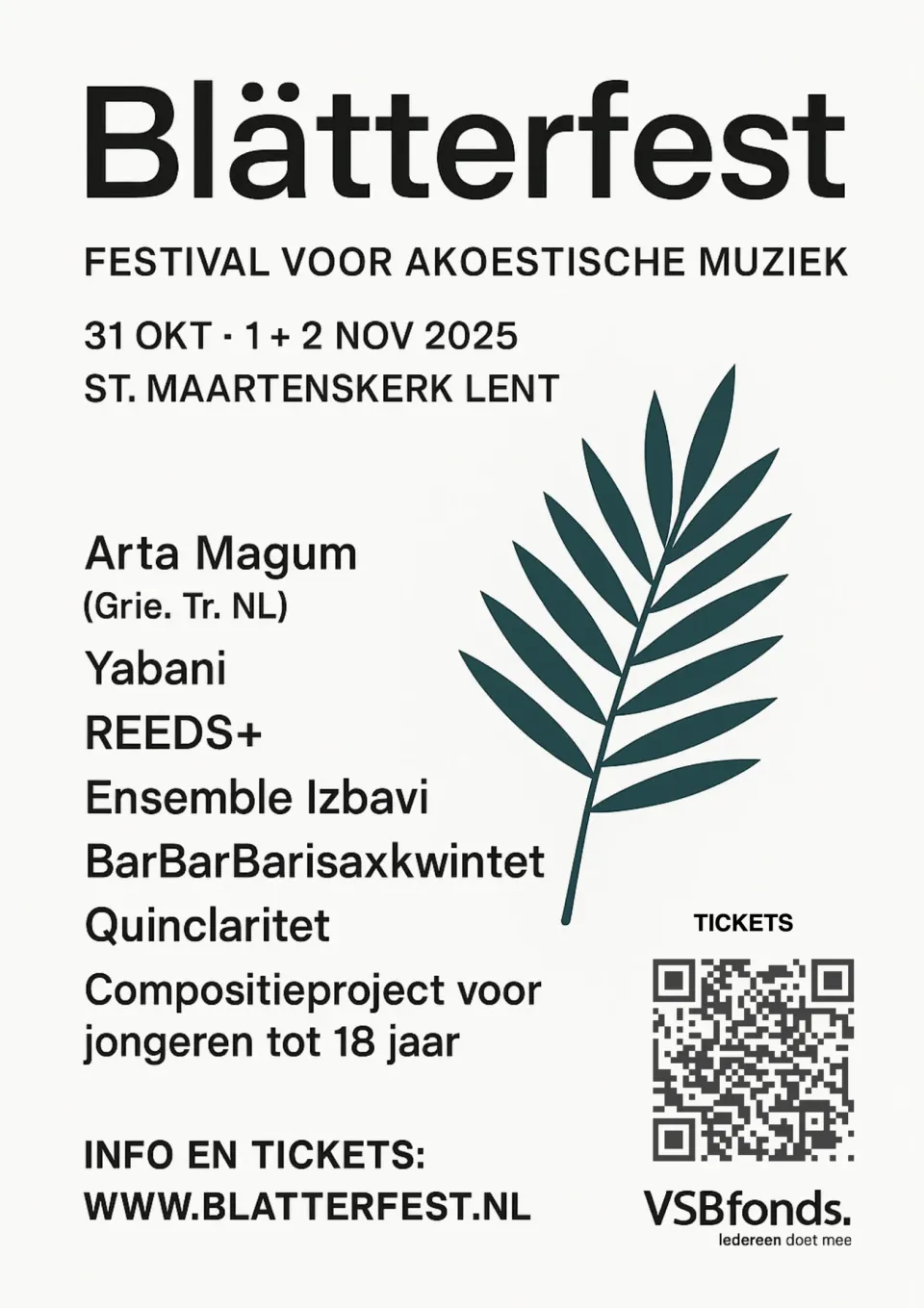 Blätterfest is een gloednieuw festival in Lent dat zich richt op, de naam zegt het al, de rieten, de “Blätter” op zijn Duits. Een saxofoonriet, een klarinetriet, noem maar op. Ieder ensemble dat geprogrammeerd staat heeft een riet- instrument in de gelederen, meerdere of alleen maar. Zo wordt de veelzijdigheid van deze instrumenten op een fraaie manier voor het voetlicht gebracht. Blätter refereert aan de tijd van het jaar waarin dit festival plaats vindt. De herfst met kleurrijke bladeren. Bovendien verwijst het naar de rijke historie van het dorp Lent met de vele tuinderijen. Er zijn vier concerten en een compositie-project voor jongeren tot 18 jaar. Drie concerten in St. Maartenskerk - Lent, 1 concert in verzorgingshuis St Jozef. De composities die de jongeren gaan maken zullen tijdens de concerten door één van de ensembles ook live uitgevoerd gaan worden. Met dank voor uw aandacht, Stichting Rootsmuziek en Bunch of Reeds Music info@stichtingrootsmuziek.nl of 06-29008711