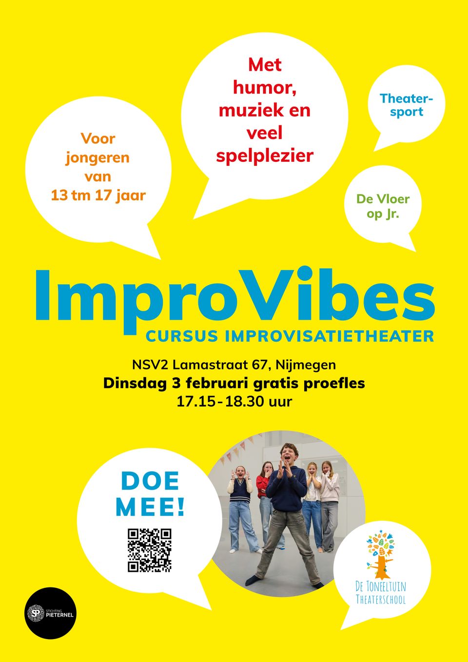 ImproVibes is een nieuwe improvisatiecursus in Nijmegen voor jongeren van 13 tot 17 jaar die willen lachen, spelen en zichzelf ontwikkelen. In 15 energieke lessen ontdekken deelnemers improvisatie via theatersport en scènes uit De Vloer Op Junior JR, leren ze samenwerken, durven reageren en presenteren, en bouwen ze zelfvertrouwen op. De cursus wordt afgesloten met een feestelijke presentatie, waardoor jongeren kunnen laten zien wat ze hebben geleerd. ImproVibes is interessant voor tieners die nieuwsgierig zijn, graag op het podium staan of nieuwe creatieve uitdagingen willen proberen – een unieke kans om spelenderwijs te groeien en plezier te hebben.