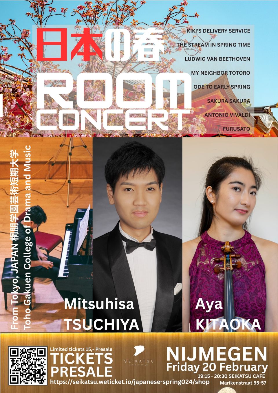 Een fantastisch initiatief van Japanse lifestyle shop SEIKATSU in Nijmegen. Op vrijdag 20 februari treden twee getalenteerde Japanse musici op: violiste Aya Kitaoka en pianist Mitsuhisa Tsuchiya. Naast diverse klassieke stukken spelen ze ook traditionele Japanse muziek en muziek uit Anime-films.