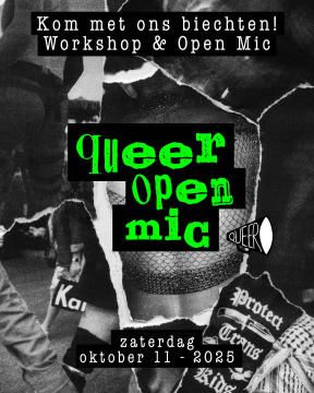 Bij de Queer Open Mic van 16.00 tot 18.00 uur in de Valkhofkapel kun je vervolgens je queer verhaal claimen. Dan verandert de historische kapel in een bruisend queer podium. FLINTA+ schrijvers, dichters, zangers en verhalenvertellers krijgen vijf minuten om het publiek mee te nemen in hun eigen biecht. Je kunt zowel optreden als luisteren; alle vormen van expressie zijn welkom.