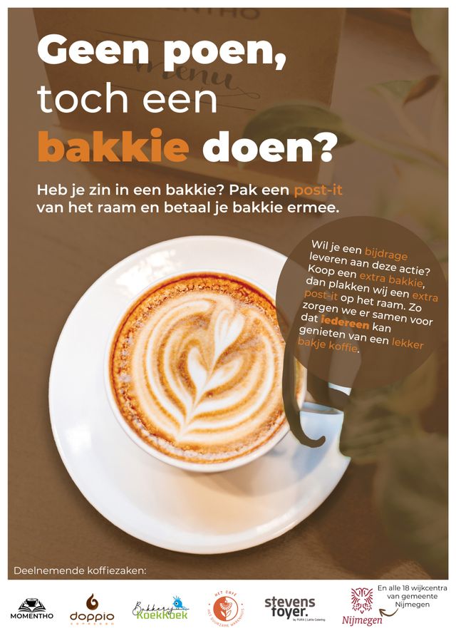 Tijdens de Nijmeegse Winterweken van 13 december tot en met 4 januari geven we meer aandacht aan de mogelijkheid om een kop koffie te doneren voor wie het kan missen én om een kof koffie te krijgen voor wie het nodig heeft. Nijmegen telt inmiddels vijf koffiezaken die meedoen aan deze actie. De koffiezaken die meedoen aan deze actie zijn: Bakkerij Koekkoek, Doppio, Het café Duurzame Warenhuis, Stevensfoyer en Momentho (bibliotheek Mariënburg). Dit jaar zijn er ook 18 wijkcentra waar je een kop koffie kan krijgen, als je deze kan gebruiken.