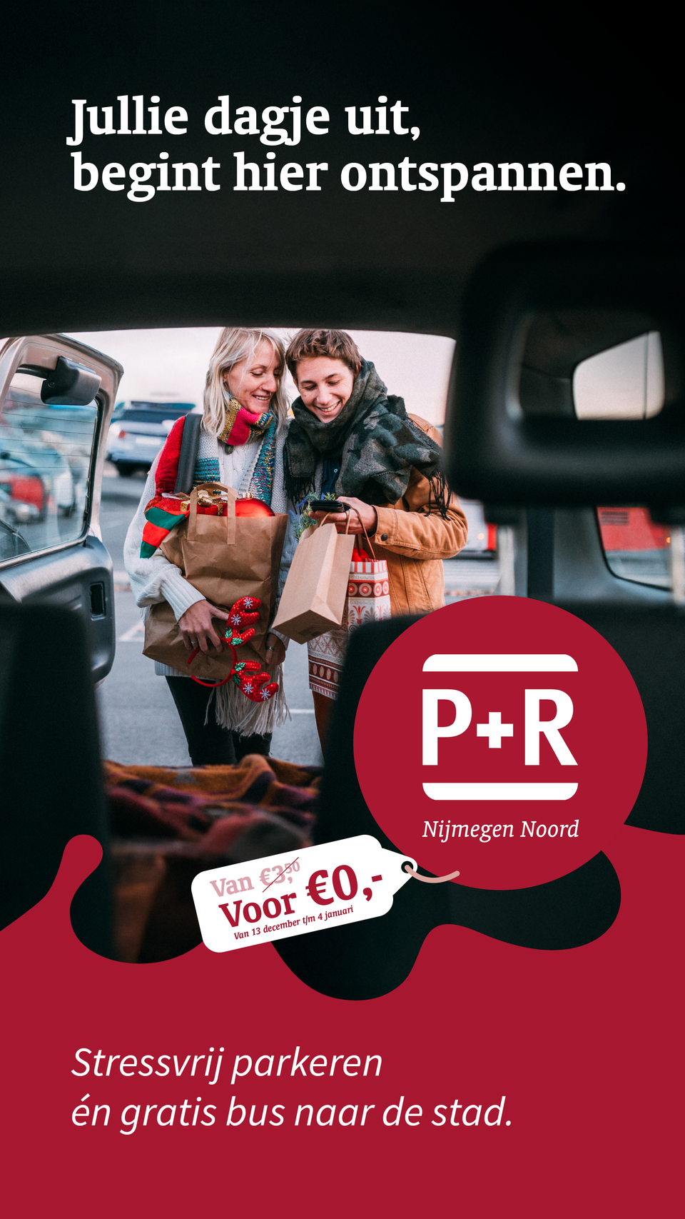 Van 13 december 2025 t/m 4 januari 2026 parkeer je gratis bij P+R Nijmegen Noord en reis je in 8 minuten met de bus naar het centrum. Je hebt géén OV-chipkaart nodig, je parkeerkaart is jouw gratis ticket.