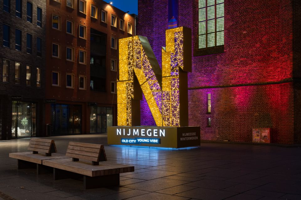 - Wandel via de gezellige Grote Straat richting de Waalkade, waar de gigantische lichtgevende ‘N’ van Nijmegen schittert aan het water.