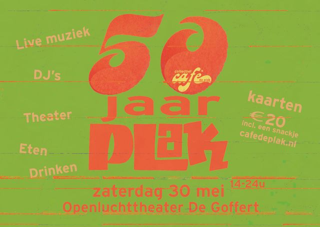 Het Nijmeegse eet- en feestcafé De Plak bestaat dit jaar een halve eeuw en gaat dat groots vieren. Op zaterdag 30 mei wordt in het Openluchttheater de Goffert een dagfestival gehouden met live-optredens, theater en sessies van DJ’s uit eigen huis.