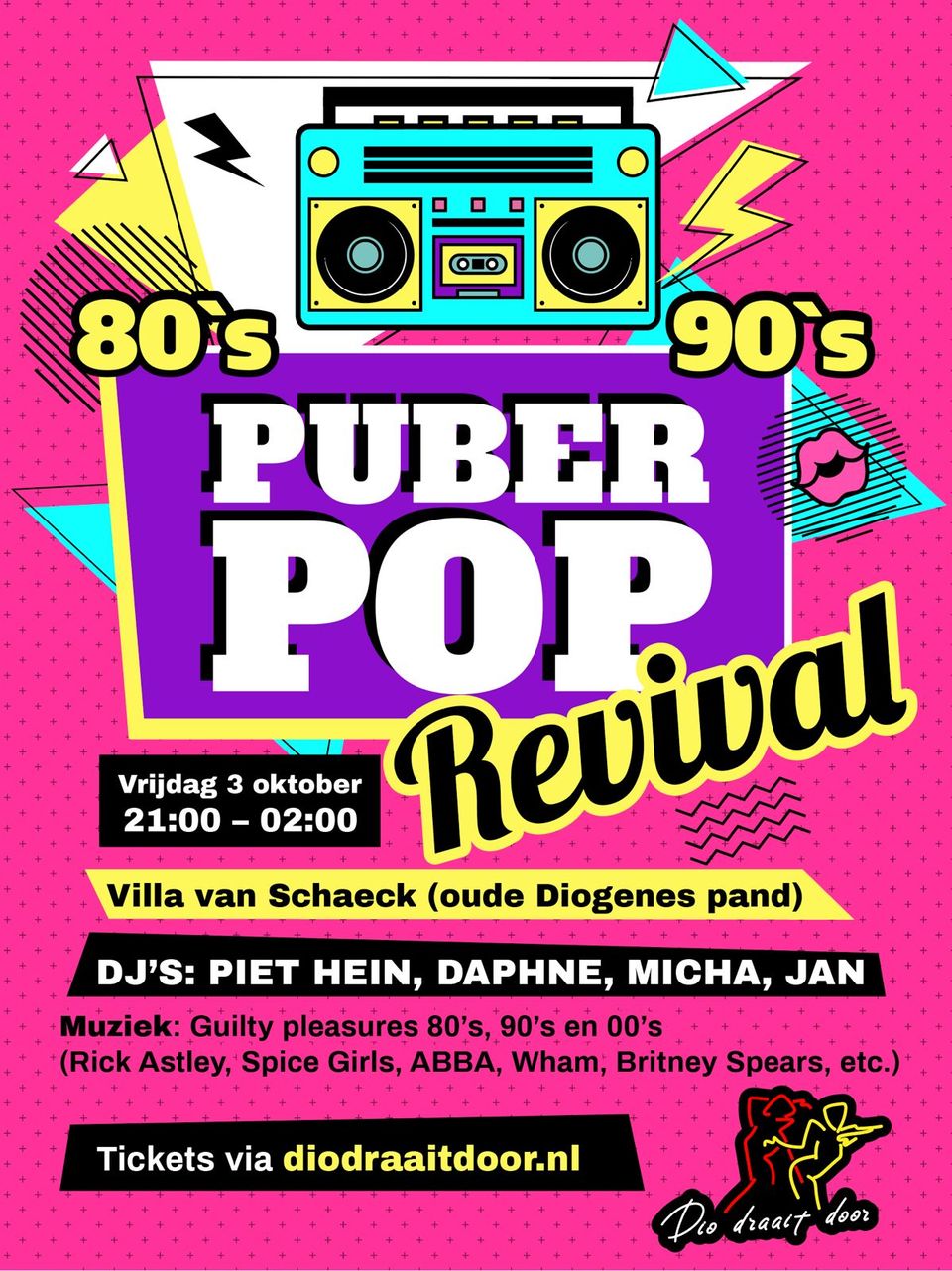 Berucht, geliefd en verguisd: PUBERPOP was hét guilty-pleasure feest van Diogenes. Op 3 oktober keren de originele PUBERPOP dj's uit de jaren ‘90 terug. Piet-Hein, Micha, Daphne en Jan duiken opnieuw hun platenkoffers in. Falco, Abba, Rick Astley – alles wat fout is, wordt weer goed. Ongegeneerd vrolijk meezingen, lachen, zweten en dansen: één nacht vol pure Puberpop-chaos.