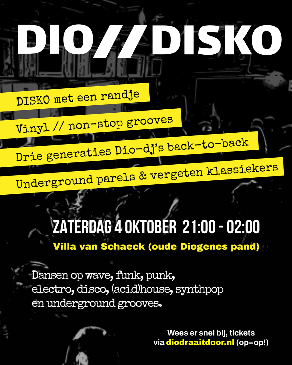 DIO//DISKO is geen discofeest, maar een statement. Drie generaties Dio-dj’s – uit de ’80s, ’90s en ’00s – brengen de eigenzinnige Diogenes-klassiekers terug naar de dansvloer. Sjirk, Paul, Pim, Joy, Laurens, Hendrik-Jan, Remy, Hansz, Erik en Michiel draaien een eclectische Dio-mix van wave, funk, punk, electro, disco, (acid)house, synthpop en underground grooves. Inclusief, eigenzinnig, activistisch en vooral dansbaar. Drie decennia Dio, twee dansvloeren, één unieke dansavond!