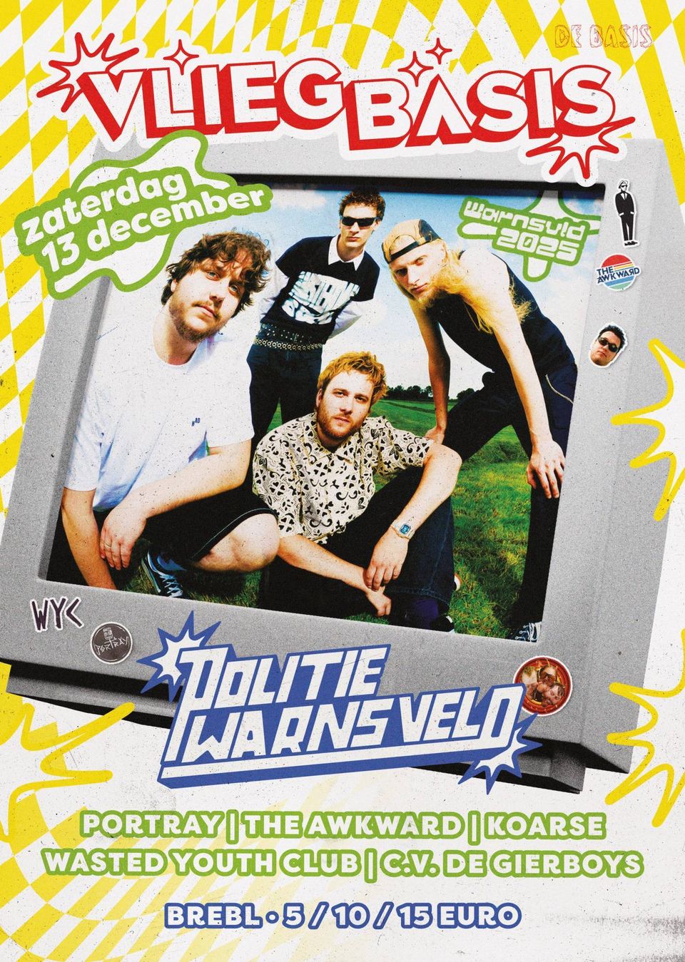 Politie Warnsveld is wat er gebeurt als je plezier écht serieus neemt. Deze ska-punkband mixt feest met chaos in een meedogenloze missie om iedereen uit z’n comfortzone te rammen. Met popnummers die moshpits ontketenen en feesten die aanvoelen als een protest, krijgen deze feestidealisten de hele wereld aan het dansen. Zonder ironie, mét oprechte chaos. Na een succesvolle zegetocht langs de Popronde-steden van Nederland speelt Politie Warnsveld een knallende thuiswedstrijd in Brebl tijdens de Vliegbasis.