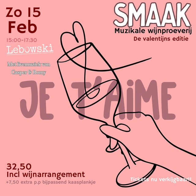SMAAK strijkt neer bij Lebowski voor een liefdevolle editie vol culinaire verassingen. Neem je geliefde mee op een romatische date bij SMAAK! tijdens de SMAAK x Lebowksi Valentijnseditie. Geniet van jullie gezamenlijke liefde: wijn, met een sausje van live muziek. Ruik, proef, haal herinneringen op en word opnieuw verliefd op degene naast je én op de smaken in je glas.