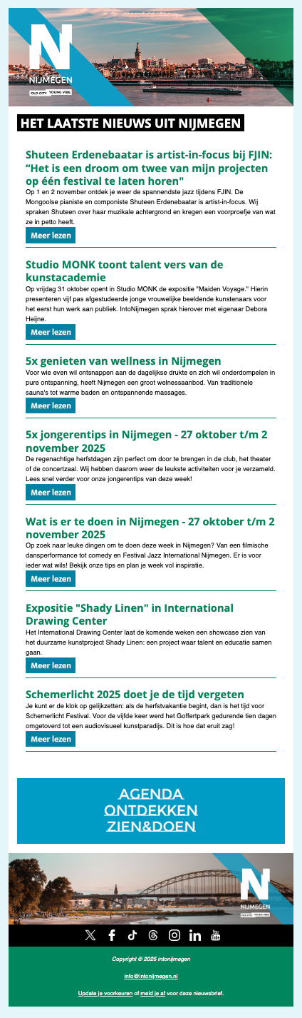 IntoNijmegen heeft een wekelijkse nieuwsbrief, waarin de leukste items over Nijmegen aan bod komen!