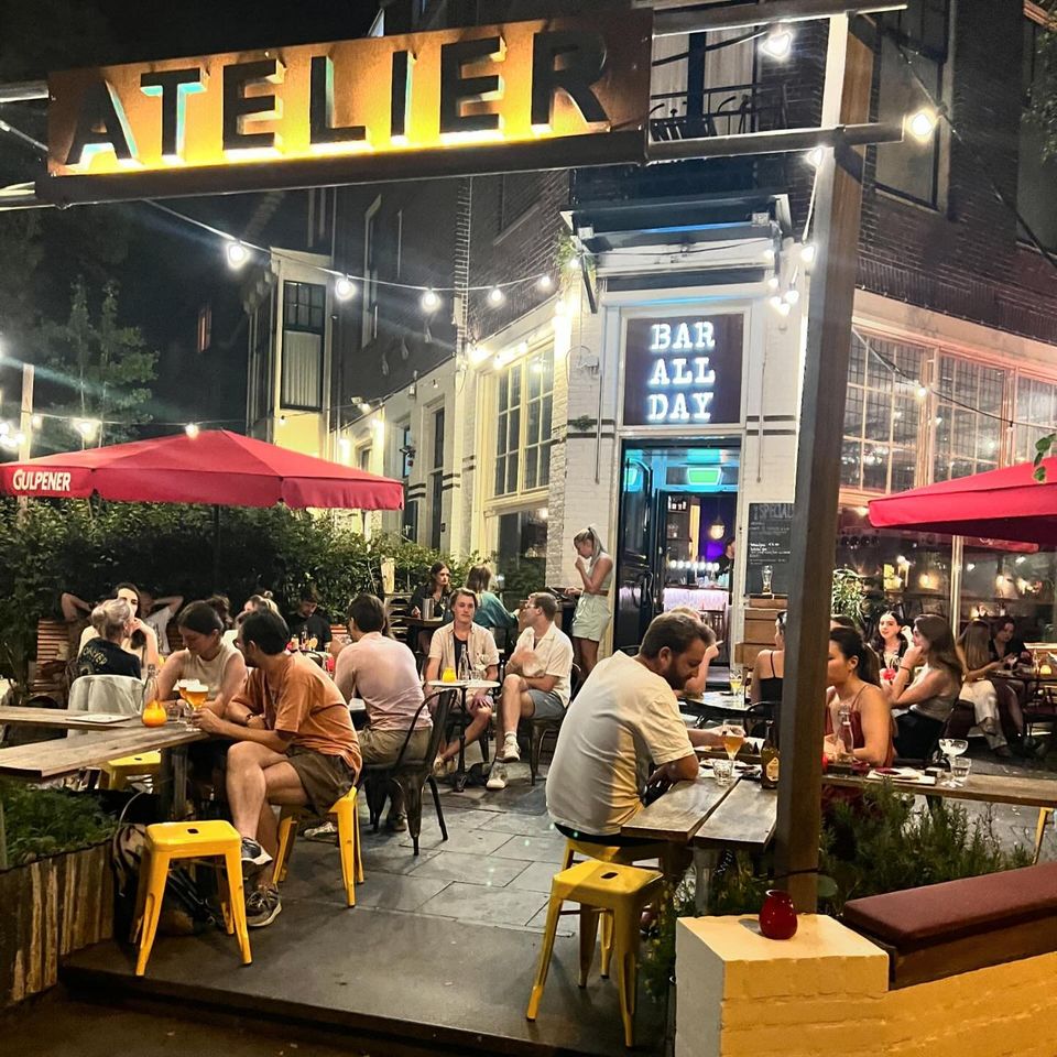 Inmiddels een zeer bekend plekje in Nijmegen: Atelier. Als het zonnetje schijnt, zit het hele terras hier gezellig vol. De cocktails, wijntjes, biertjes en borrelbites vliegen dan over de toonbank. Ook voor lunch en brunch schuif je hier aan! En wanneer de avond valt, blijf je gewoon gezellig hangen voor de sfeer en gezelligheid die hier altijd te vinden is.