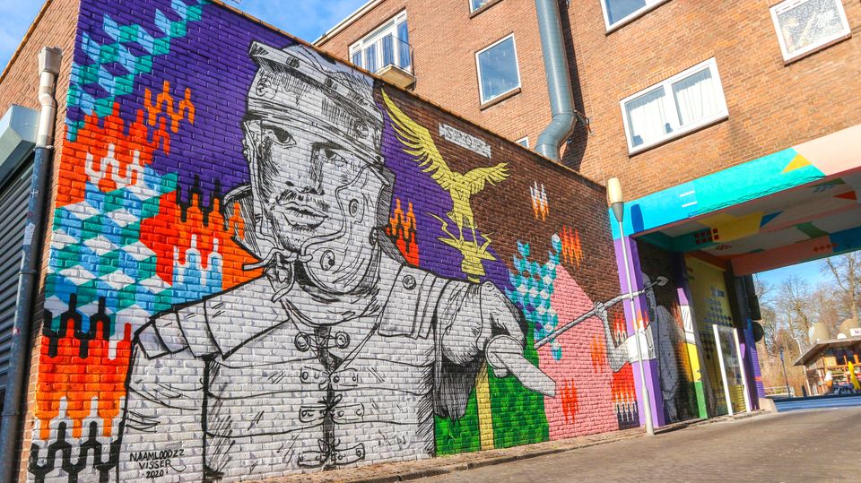 De Bataafse Opstand was een opstand van de West-Germaanse Bataven onder leiding van Gaius Julius Civilis rond het jaar 70 na Christus. Tijdens de Tachtigjarige Oorlog kreeg de Bataafse opstand een soort mythische reputatie als een strijd voor vrijheid. Net zoals de Bataven vochten tegen hun Romeinse opperheer, vochten de Nederlanders tegen de Spaanse opperheer. In de tijd van de Republiek bleven de Bataven populair. “Hierachter ligt Kelfkensbos. De stad (Oppidum Batavorum) werd door de Romeinen gebouwd voor de Bataven.” vertelt Dennis Jussen van project Waalpaintings. “Ook die stad werd tijdens de Bataafse opstand platgebrand. En dat wordt in deze muurschildering afgebeeld.”