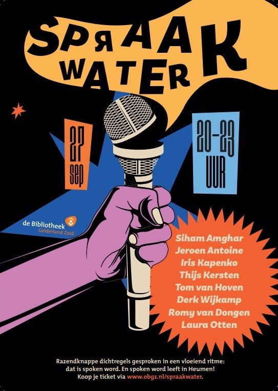 Razendknappe dichtregels gesproken in een vloeiend ritme: dat is spoken word. Op dinsdagavond 27 september organiseert Bibliotheek Malden samen met de dorpsdichter van de gemeente Heumen, Thijs Kersten, een avond vol met woordkunst: SPRAAKWATER. Diverse lokale woordkunstenaars zullen de bühne betreden, waaronder Jeroen Antoine, Siham Amghar en natuurlijk Thijs zelf. De presentatie is in handen van de Nijmeegse nachtburgemeester Cees de Beer. Kaarten zijn hier verkrijgbaar en kosten € 9,50 voor bibliotheekleden en € 12 voor overige bezoekers.