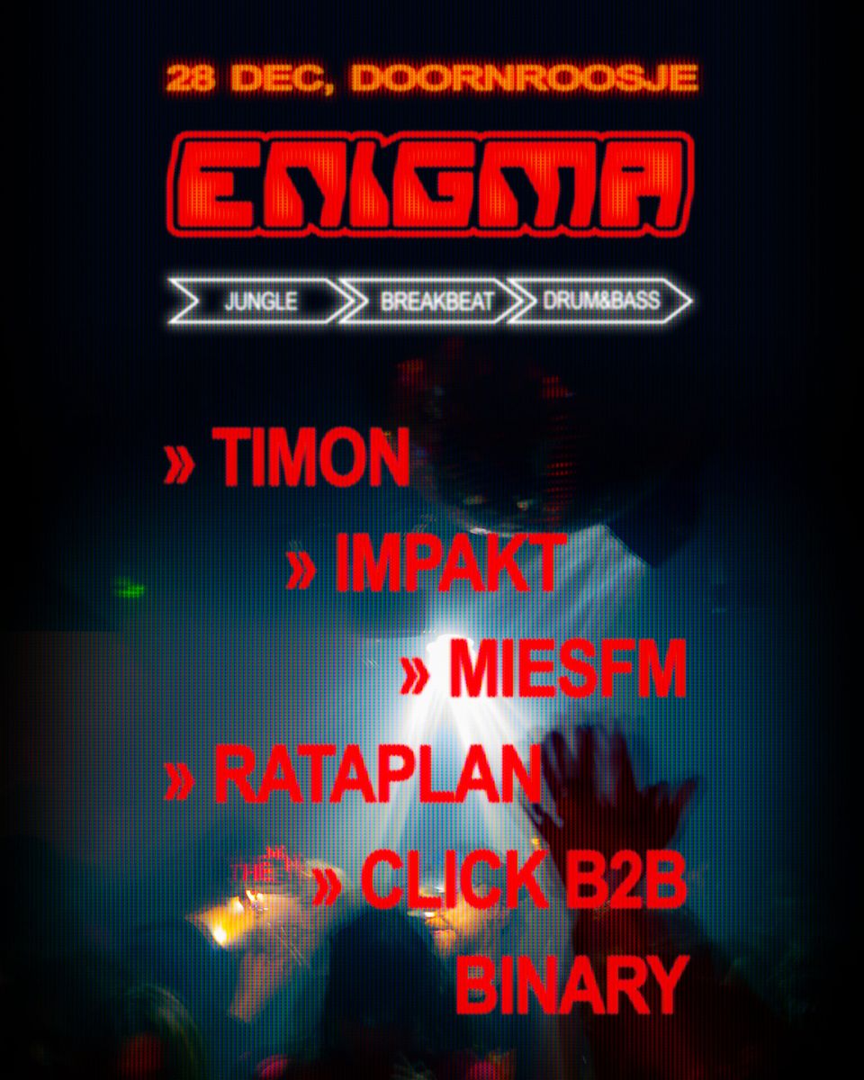 Na jarenlang de kelder van De Plak te hebben omgetoverd tot rave cave, gaat Enigma nu bovengronds voor hun allereerste editie in Doornroosje! Je bent welkom in De Vide voor een avond vol snelle breaks, jungle en Drum and Bass. De underground sounds blijven hetzelfde, maar de locatie is nieuw! En het beste nieuws: deze nacht vol explosieve beats is, zoals altijd, helemaal gratis!