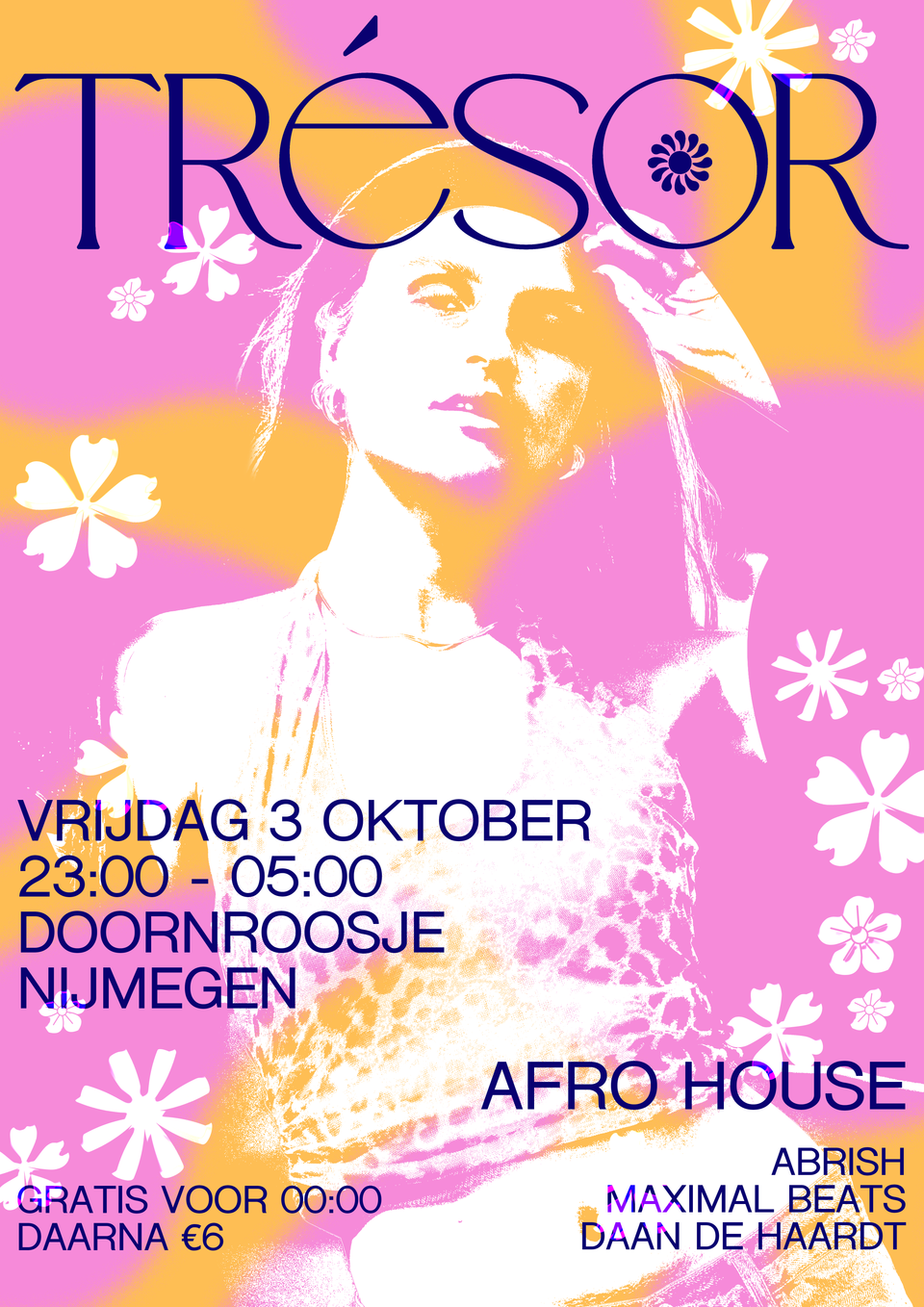 Trésor is de nieuwste clubavond die Nijmegen wakker schudt! Wat afgelopen zomer nog besloten begon op het Waalstrand, krijgt nu zijn eerste officiële editie in Doornroosje. Dit evenement staat volledig in het teken van het opkomende genre Afrohouse en trakteert de stad op een gloednieuwe, warme sound. De nacht wordt gevuld door een sterke line-up, met Maximal, Daan de Haardt en Abrish, die de dansvloer overnemen tot diep in de ochtend. Dit is dé plek voor de dansers, de liefhebbers en de ontdekkers van nieuwe, diepe grooves.
