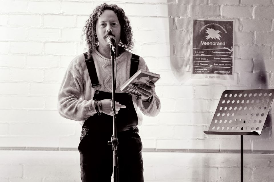 Vervolgens was het de beurt van de eerste dichter van de avond, Eva Meijer. Hen schrijft romans, essays, poëzie en academische filosofie, en hun werk is vertaald in meer dan twintig talen. Met hun gedicht over long-covid wist hen de hele zaal te raken en mee te slepen in de werkelijkheid waar mensen met long-covid helaas nog steeds mee te kampen hebben. Een inspirerend stuk waarmee hen direct de kracht van poëzie liet zien. Daarna volgde Robin Block, dichter, muzikant, theatermaker en columnist. Zijn Indonesische roots zijn een grote inspiratiebron voor zijn poëzie en met zijn stuk over Jakarta wist hij iedereen vanaf de eerste seconde mee te slepen. Zijn beeldende teksten raakten diep en de hele zaal luisterde in spanning mee. Daarna was het hoogste tijd voor pauze om alle indrukken te verwerken.