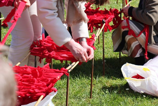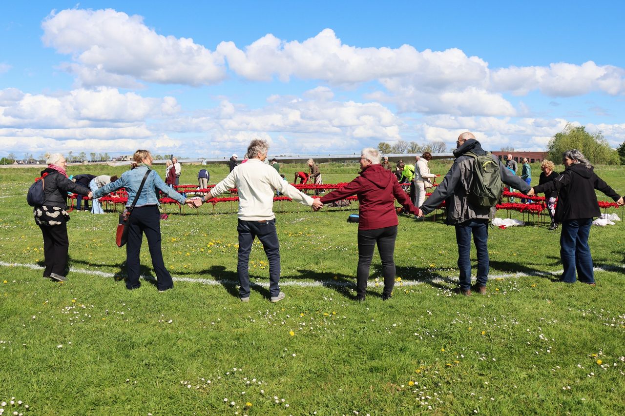 Ter afsluiting stonden alle deelnemers in een kring om de duif en dachten hartstochtelijk aan vrede, zowel ver als dichtbij. Het is de bedoeling dat de komende weken wenslinten aan de duif worden geknoopt. Iedereen mag een bijdrage leveren zodat de pelgrims op hun reis op 2 mei worden begroet door een kleurrijk geheel.