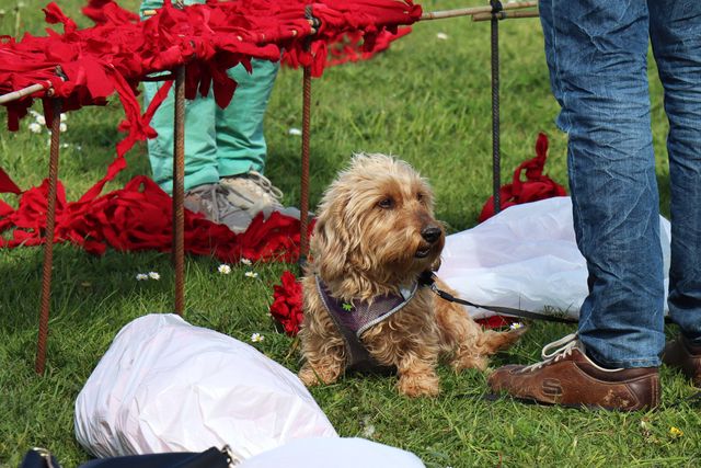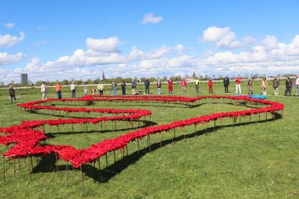 En toen naar buiten, waar de stad zich opmaakte voor de bekerfinale van NEC en de straten zich vulden met vlaggen en in clubkleuren gehulde fans. Als voorproefje van de Peacewalk liepen we een stukje in omgekeerde richting, via de Waalkade en de Snelbinder naar Veur-Lent waar kunstenaar Andreas Hetfeld zijn vredesduif opnieuw had opgebouwd. Gezamenlijk werd het kunstwerk omwikkeld met rode linten, korte stukken aan elkaar geknoopt. Elk stuk staat voor een slachtoffer in Gaza, een adembenemende hoeveelheid als je ze zo bij elkaar ziet.