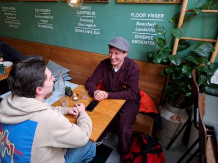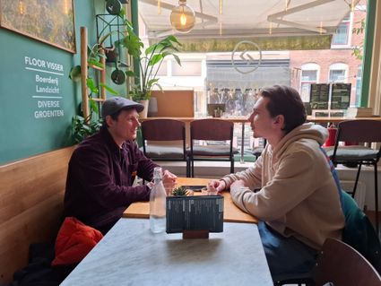 Terwijl ons een stuk zoete-aardappel-cheesecake wordt geserveerd, laat hij me trots een foto zien die hij tijdens zijn laatste wandeling in de stad had gemaakt. Het is de tekst ‘Refugees Welcome’, die met graffiti op de Waalbrug staat geschreven. "Dat vind ik nou echt te gek, dat is nou echt Nijmeegs. Nijmegen is een stad die staat voor idealen.’’