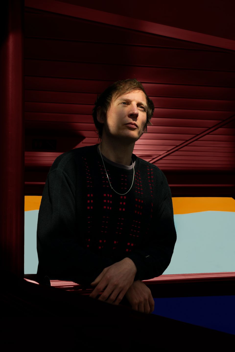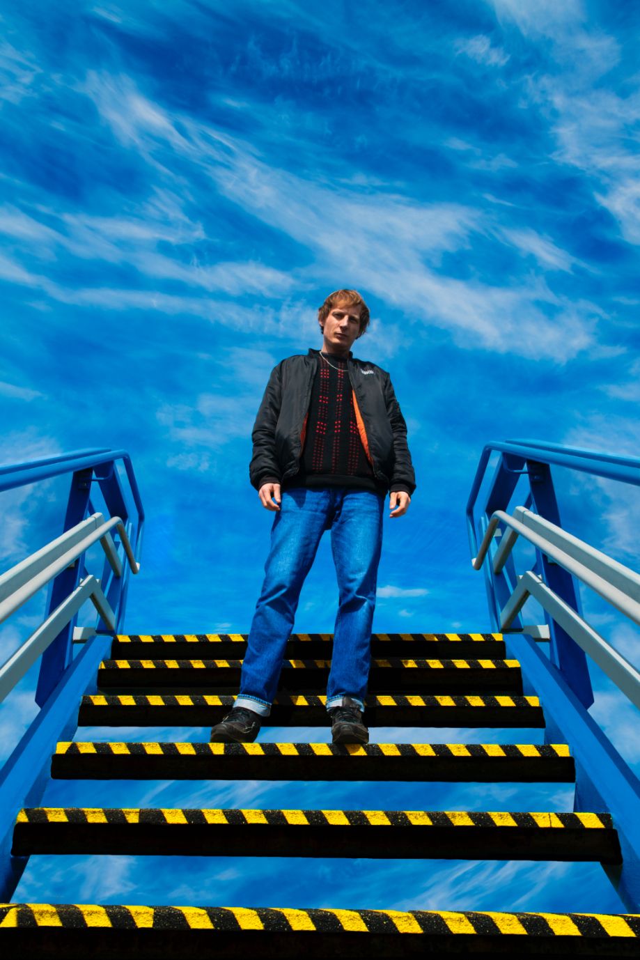 Zo nuchter als zijn houding is, zo excentriek is zijn outfit. Zijn Thunderdome-jas, gedragen over een auberginekleurig katoenen werkpak en Air Max ’90, wordt gecompleteerd door zijn karakteristieke baret en een knalrode sporttas. Het weerspiegelt de kenmerken die hem hebben gevormd als mens en artiest: uitgesproken doch bescheiden, sportief en toegankelijk, met duidelijke invloeden uit de jaren negentig. Hij straalt uit dat hij liever maakt dan poseert, wat het interview alleen maar ten goede zou moeten komen.