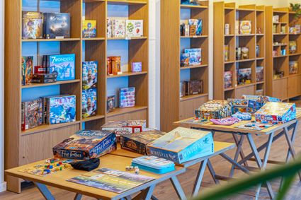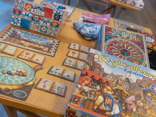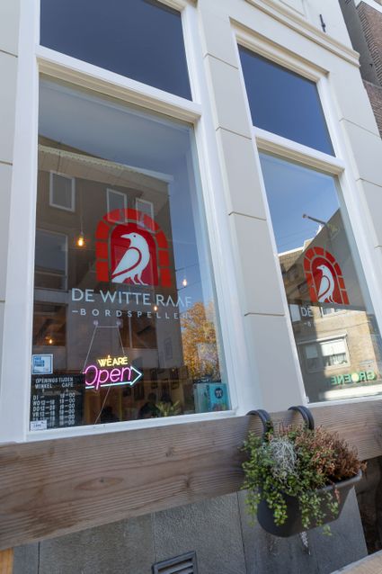 Als je voorbij het pand loopt, kun je al redelijk snel opmaken dat dit een spelletjescafé is. In de vensterbank pronken een aantal kleurrijke bordspellen en als je verder door het gevelraam tuurt, zie je achterin schappen vol spellen.