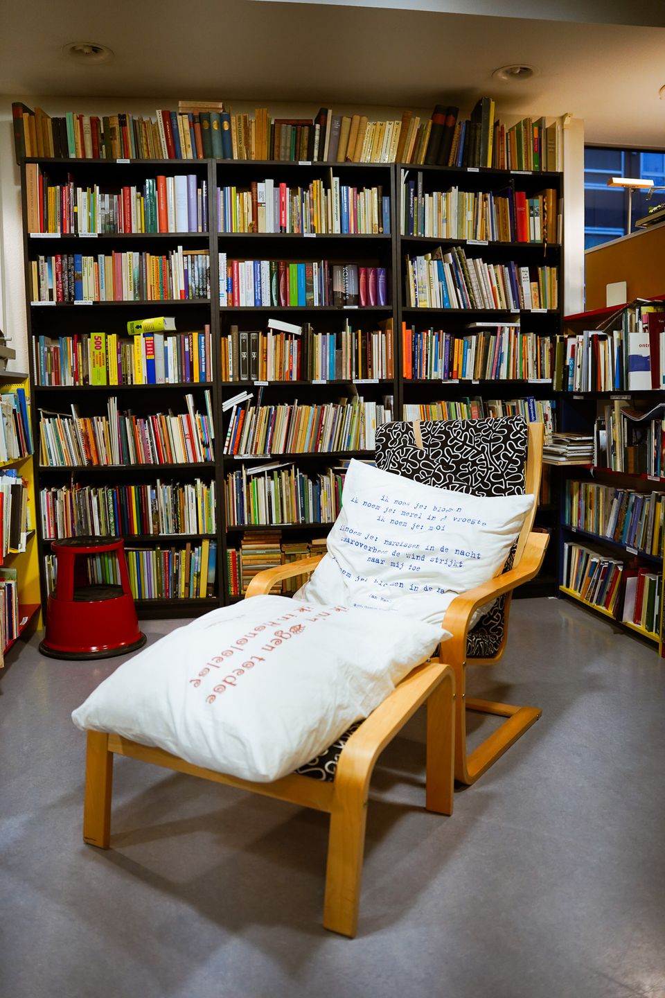 De ruimte is kleurrijk door de gekleurde boekenkasten, het oogt een beetje rommelig, maar niet onrustig. De vitrinekasten lijken grote kweekbakken. Ze trekken de aandacht, zoals bijvoorbeeld de bak met een verzameling queerpoëziebundels.