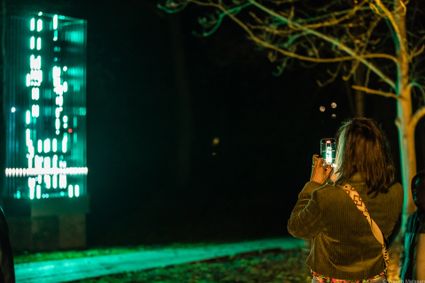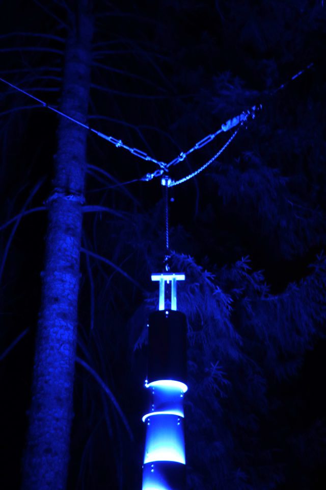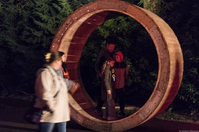 Tenslotte doemt tussen de rood verlichte bomen een blauwe lichtsculptuur op. Een langzaam draaiende cilinder met zachte muziek op de achtergrond. Dalsoon is geïnspireerd op het ritme van de maan en door de draaiing veranderen de vorm en het licht voortdurend.