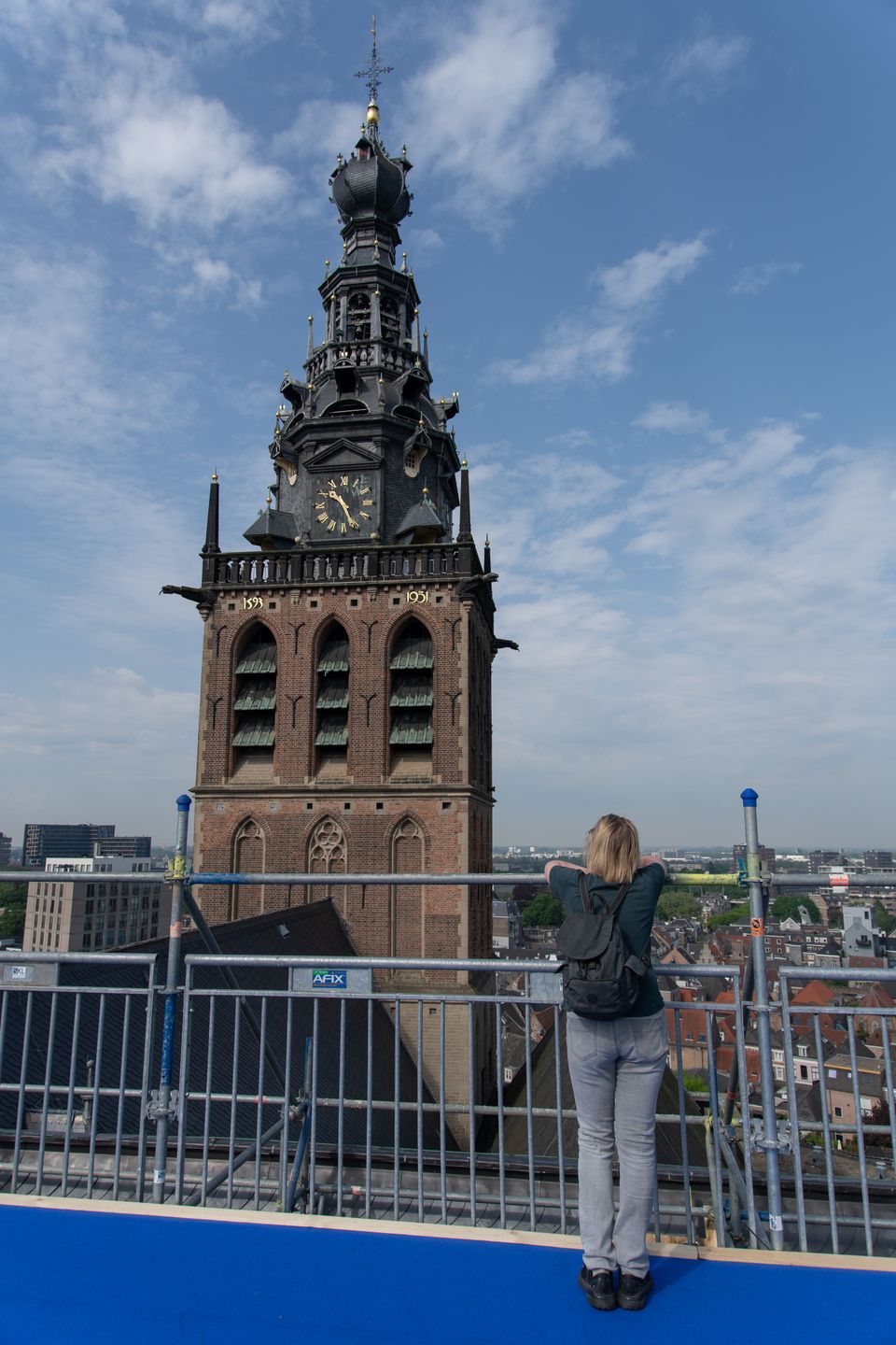 Eenmaal op 24,5 meter hoogte wacht een blauwe loper die je over het dak van de Stevenskerk leidt. Vanaf dit unieke uitkijkpunt zie je een prachtig panoramisch uitzicht over de oudste stad van Nederland. De indrukwekkende Waalbrug verbindt de oevers van de Waal, terwijl in de verte de groene vlaktes van de Ooijpolder zich uitstrekken. Theo Andriessen verwoordde zijn enthousiasme treffend: "Ik vond het zelf heel bijzonder om het dak van de kerk te zien, en we wilden een klim organiseren om mensen ook het prachtige uitzicht te laten zien."