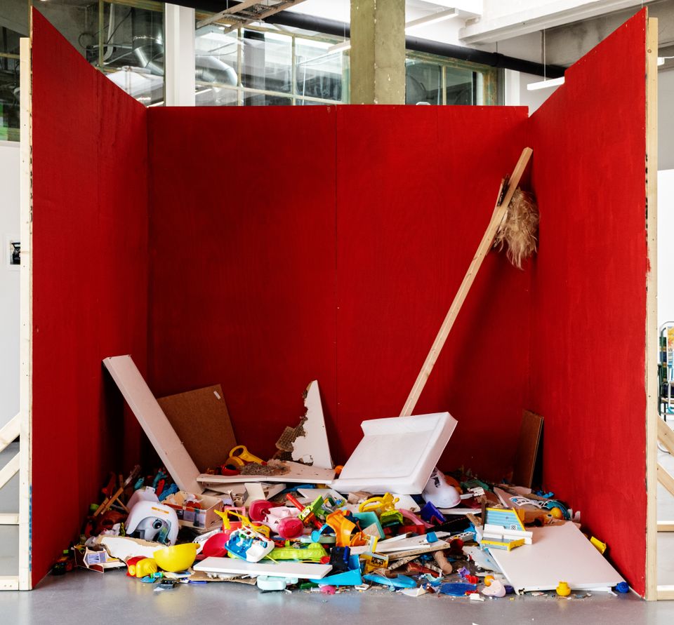 De grootste aanwijzing daarvoor is de rage room, een houten hok met zwarte gordijnen midden in de ruimte. Aan de ingang staat een ijzeren rek vol kinderspeelgoed, bedoeld om stuk te slaan. Of dit duurzaam verantwoord is, laat Linssen in het midden. Maar het gevoel dat het oproept, sluit perfect aan bij het thema. De ruimte biedt bezoekers – kinderen én ouders – de mogelijkheid hun frustraties te uiten.