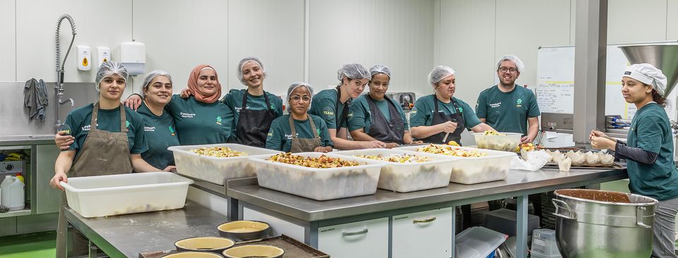 In de bakkerij werkt een vast, multicultureel team van bakkers en vluchtelingen, allemaal in dienstverband. Dagelijks krijgen zij versterking van mensen die meedoen via een sociaal of inburgeringsprogramma. Iedere vaste medewerker is buddy van een tijdelijke medewerker. Ze werken samen als duo – vijf vaste krachten betekent vijf extra collega’s op de werkvloer. De dagteams zijn zelfsturend: elke ochtend bespreken ze hoe ze het werk die dag aanpakken. In de lunchpauze koken en eten ze samen met het management een gezonde, milieuvriendelijke maaltijd. Vaak is het iets warms, zoals soep of pasta, zodat iedereen gezond eet, ongeacht hun financiële situatie.