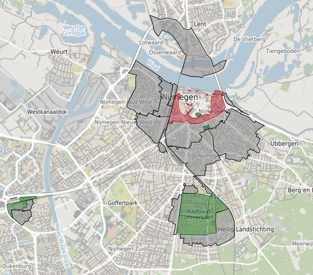 Buiten de binnenstad hanteert de gemeente verschillende parkeerzones. Op de gemeentelijke plattegrond van Nijmegen zijn rode, groene en grijze zones aangegeven zoals je hieronder ziet.