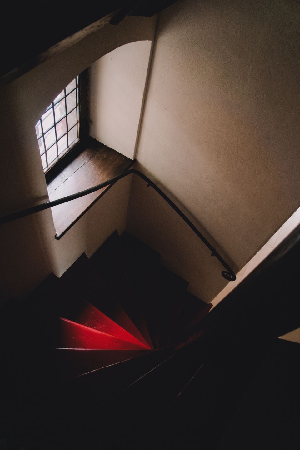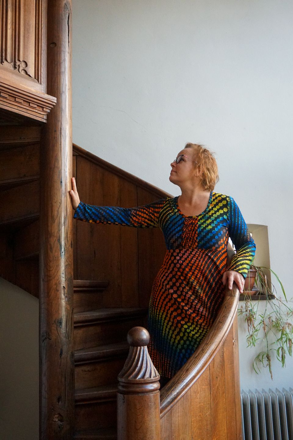 Het Besiendershuis heeft dan ook een merkwaardige constructie die bijdraagt aan de bijzondere sfeer die er hangt. De beneden- en bovenverdieping zijn van elkaar gescheiden met een opmerkelijke, houten ‘hangkamer’. Dit is een soort vertrek dat aan het plafond hangt van de onderste ruimte. Via de wenteltrap loop je het donkere vertrek in. “Deze kamer zit als het ware in tussen jou en de buitenwereld”, vertelt Marloes.